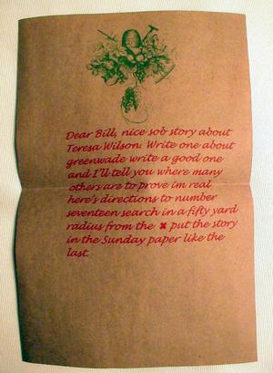 In May 2002 Bill Smith, a reporter for the St. Louis Post-Dispatch, wrote an article to shine light on the unsolved murders. He concentrated his article on Teresa Wilson-the second victim. This is when Maury Travis revealed himself. He sent the above letter to Smith along with a map. Police were able to discover Travis' identity based on his map and the internet service he used to make it. But when police arrived at his home, they uncovered haunting evidence. Travis had turned his basement into a sort of dungeon. He had a video tape marked "Wedding Day." The tape began with an actual wedding, but then home videos of Travis's rapes and kills followed. He would often get high with his victim, psychologically torture them. Once that torture was over, he would then rape them, shock them with a taser and strangle them-all on video. Travis claimed he had 17 victims. Police were able to firmly identify 11 and recover four bodies they believe were killed by Travis. But those four identities are unknown.