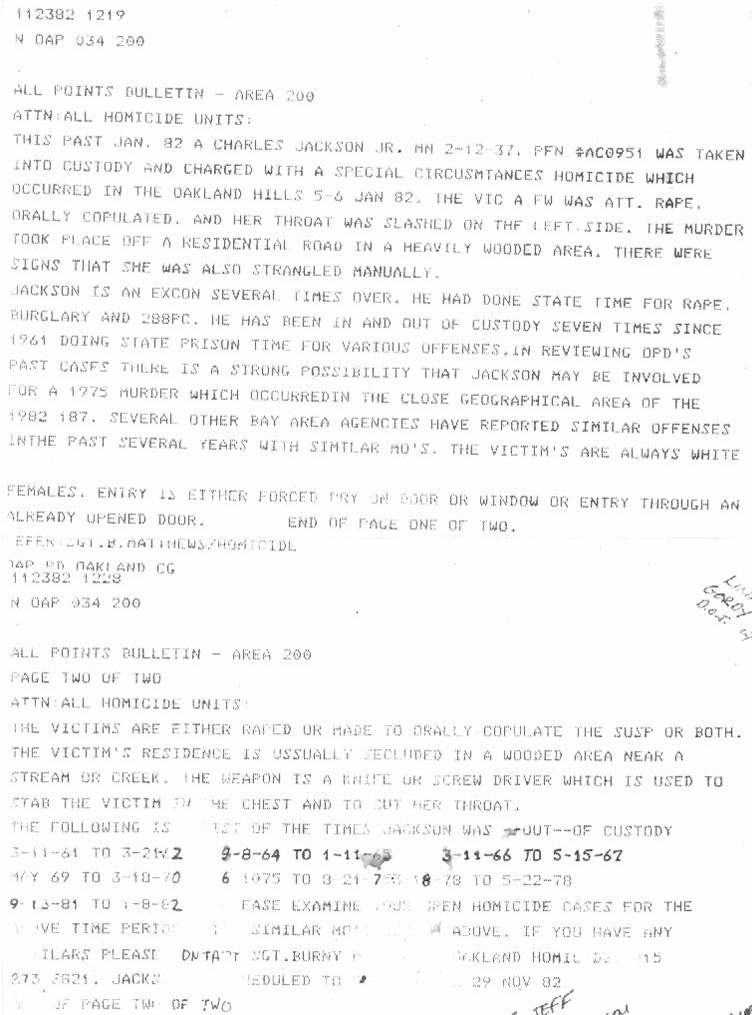 We are looking for possible victims of Charles Jackson. He was active in the East Bay and Oakland areas. When searching for possible matches please use the parole timeline above for possibilities. Also keep in mind his MO: usually attacked women alone at home, strangled or stabbed them, and sexually assaulted them.