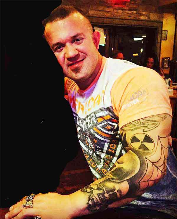 He has several tattoos: an iron cross on his right arm; a spiderweb on his right elbow; a large skull on his right arm; and a fall out sign on his right arm.