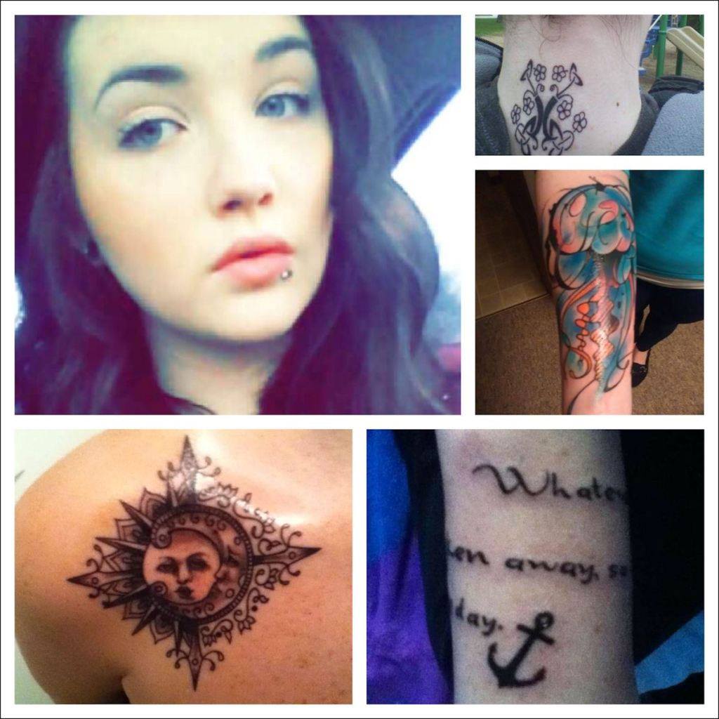 She has several tattoos: a sun and moon inside a Celtic four-star design on the right side of her chest near her shoulder, an anchor with the sentence "Whatever you love can be taken away, so live like it's your dying day."