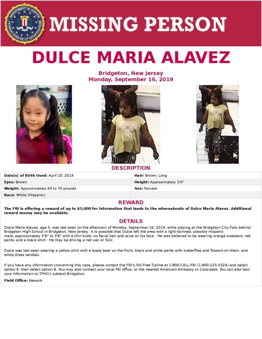 On September 16, 2019, a five-year-old little girl went to get ice cream with her mom, brother and another child relative. The group was seen on surveillance cameras at the ice cream shop at 4 PM. After getting ice cream 19-year-old mother Noema Alavez took the children to the nearby Bridgeton City Park, which is roughly a 1000 acres of land. Five-year-old Dulce and her three-year-old brother ran to play, while her mom and the other child stayed in the car. Around 4:20 PM, Noema looked up and realized she could no longer see her two young children because a hill was blocking her view. She and the other child left the car to look for them. They found Dulce’s little brother very upset, but no Dulce. Someone at the park told Noema Dulce was taken. Noema called her brother and told him to walk to the park with the dog to see if he saw Dulce. Then she called 911. The following day, the FBI and community had joined in the search. An Amber Alert went out for Dulce and it included a possible suspect. According to the alert, she had been led away from the playground to a red van with a sliding door and tinted windows. The person who took her to the car was described as a light skinned, possibly hispanic male. He was 5 foot 6 wearing orange sneakers, red pants and a black shirt. September 19th, her family pleaded on TV for Dulce’s safe return. A reward had been gathered totalling $20,000. In the coming days, the award continued to grow. And law enforcement made a plea to the public for anyone with pictures or video taken in the area that day to come forward. The hope was maybe someone unknowingly had caught Dulce and her abductor in the background. Law enforcement began to gather possible abductors. They look into Dulce’s father. According to Noema there were custody issues regarding Dulce. But her father is located in Mexico. Officers speak with him. He hasn’t been ruled out officially, but reports say he was in college in Mexico on the day of the disappearance. In 2002, law enforcement investigated a tip that claimed Morgan was buried on property in Booneville, Arkansas. There was no sign of Morgan. Authorities continue to talk to other witnesses in the area. Based on some of those conversations, they release a sketch of another possible witness to Dulce’s disappearance. The details for this “witness” are a little different than the Amber Alert. He is described as hispanic between 5 foot 7, roughly 30-35 years old. He was last seen wearing a white t-shirt, blue jeans and a white baseball style hat. Law enforcement is still actively looking for Ducle. Based on street cameras from the area, there were roughly 400 vehicles near the park at that time. So far law enforcement has been able to clear about 80% of those vehicles. But that still leaves nearly a 100 vehicles not yet identified. FBI Agent Daniel Garrabrant says investigators believe the abductor knew the area and most likely had a reason to be at the park that day. While they believe the sketch and description from the Amber Alert could be accurate, they also want people to be aware of someone who may have started acting differently around this time. The offender may have changed their appearance, not shown up for work. Even now, over a year later, law enforcement still gets several tips a week on the case. The current working theory is that Dulce is no longer in Bridgeton. The FBI wants the entire country to be on alert.