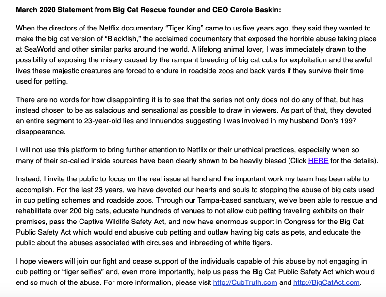 Rumors: The most circulated rumor thanks to the Tiger King series is that Carole killed Don, used a meat grinder to dispose of him before feeding him to the big cats on her property. But the Hillsborough County Sheriff's Office searched the property and found no signs of foul play. Also there were no meat grinders on the property. According to other employees the meat grinder were removed and non-functional weeks before Don disappeared. The other rumor the Joe Exotic, the star of Tiger King, voiced was that Don was inside a specific septic tank on the property. Law enforcement has confirmed the septic tank did not exist at the time of Don went missing. We contacted Carole Baskin in hopes that she would talk with us about Don. She declined. Below is her statement.